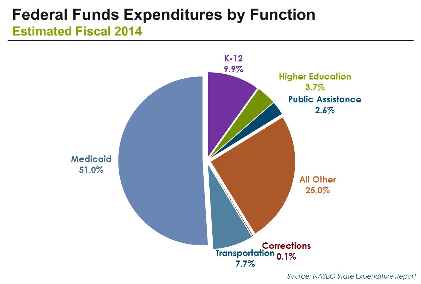 In fiscal 2014, Medicaid comprised 51 percent of all federal funds to states, according to NASBO’s State Expenditure Report, released in November 2014. This marked the first time in the 27-year history of the State Expenditure Report that Medicaid represented over half of all federal funds to states.