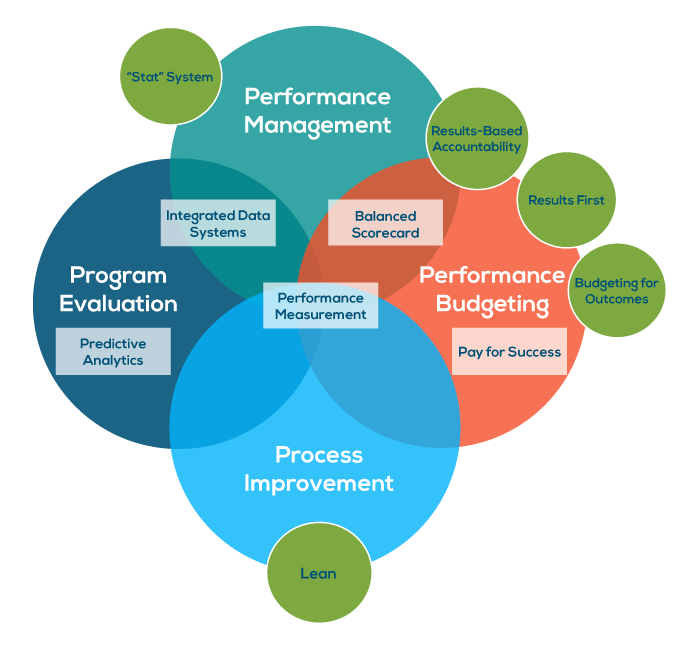 The chart below provides a visualization of how the different methods and tools listed above and discussed in the brief are connected. The four large circles represent broad methods or approaches to data-informed decision-making – (1) performance management, (2) program evaluation, (3) process improvement, and (4) performance budgeting. The smaller circles are specific forms of the larger circles with which they overlap. Meanwhile, the items in rectangles represent various tools that support the approaches that they overlap with in the chart.